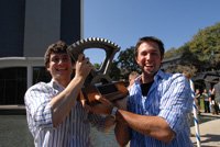 Kevin Noertker and Marc Sellsof Team Newt N' Salamander won the 25th Annual ME 72 Contest which was held on Tuesday, March 10, 2009. Teams of two students each competed to design and build an amphibious craft that would crawl into and swim across Millikan pond, clean up floating debris, and crawl out at the opposite end, depositing its cargo at the top of the bridge. Marshall Grinstead and Edmond Wong of Team Ramen and Cheesesteaks won second place this year. Congratulations to all the participants! [NBC video coverage] [CBS video coverage]