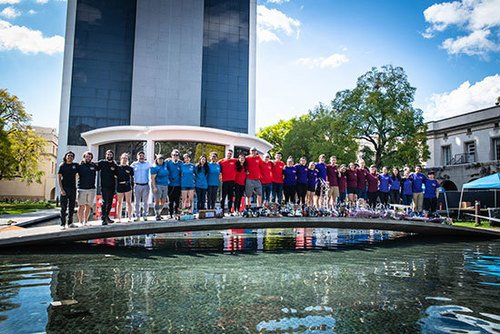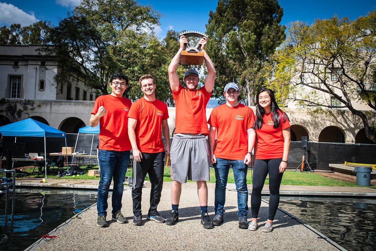 Caltech's annual engineering design competition returned for its 35th installment. Five teams of Caltech undergraduates spent months building three amphibious remote-controlled robots per team that could drive into Millikan Pond and speed across the water to drop, shoot, or push balls into targets and outscore the opposing team. It was a high-stakes afternoon of capsizing, cheering, and triumph. [Caltech story]