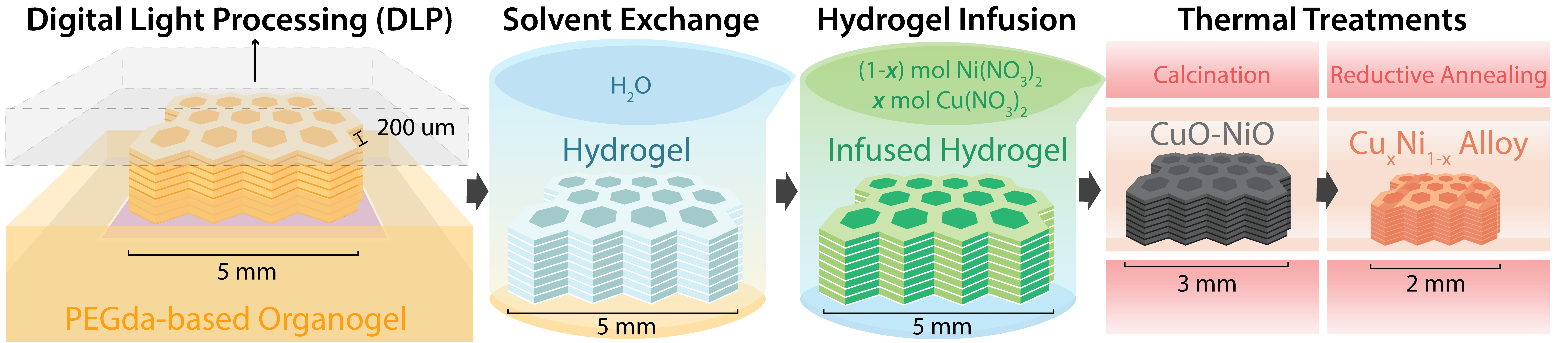 The paper is titled "Multiscale Microstructural and Mechanical Characterization of Cu–Ni Binary Alloys Reduced During Hydrogel Infusion-Based Additive Manufacturing (HIAM)." The work was supported by the US Department of Energy's Basic Energy Sciences program and by a National Science Foundation graduate fellowship.