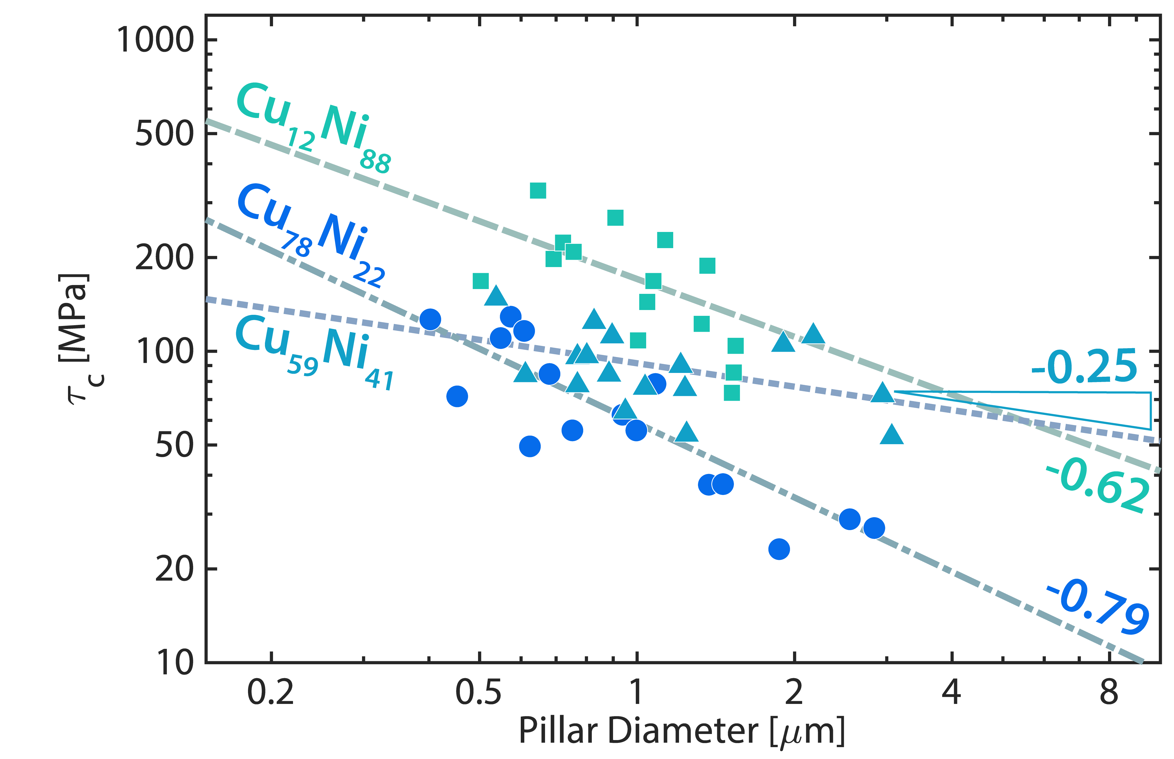 As a result, the new paper shows that the strength of alloys created by HIAM is determined not only by the size of the grains within the metals—as was previously thought— but also by their composition. A Cu12Ni88 alloy with 12 atoms of copper for every 88 atoms of nickel, for example, is nearly four times as strong as a Cu59Ni41 alloy that has copper and nickel in a 59/41 ratio.