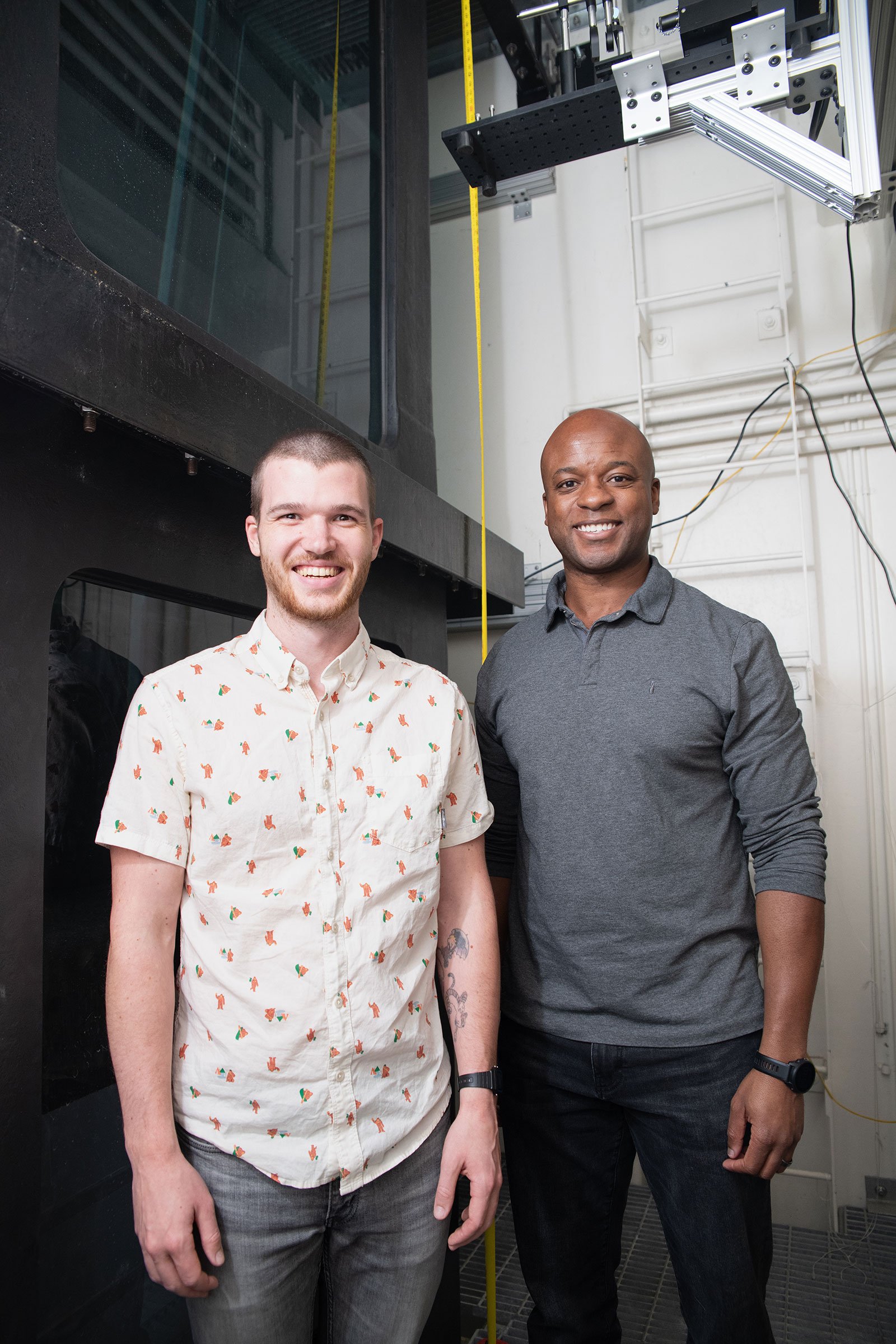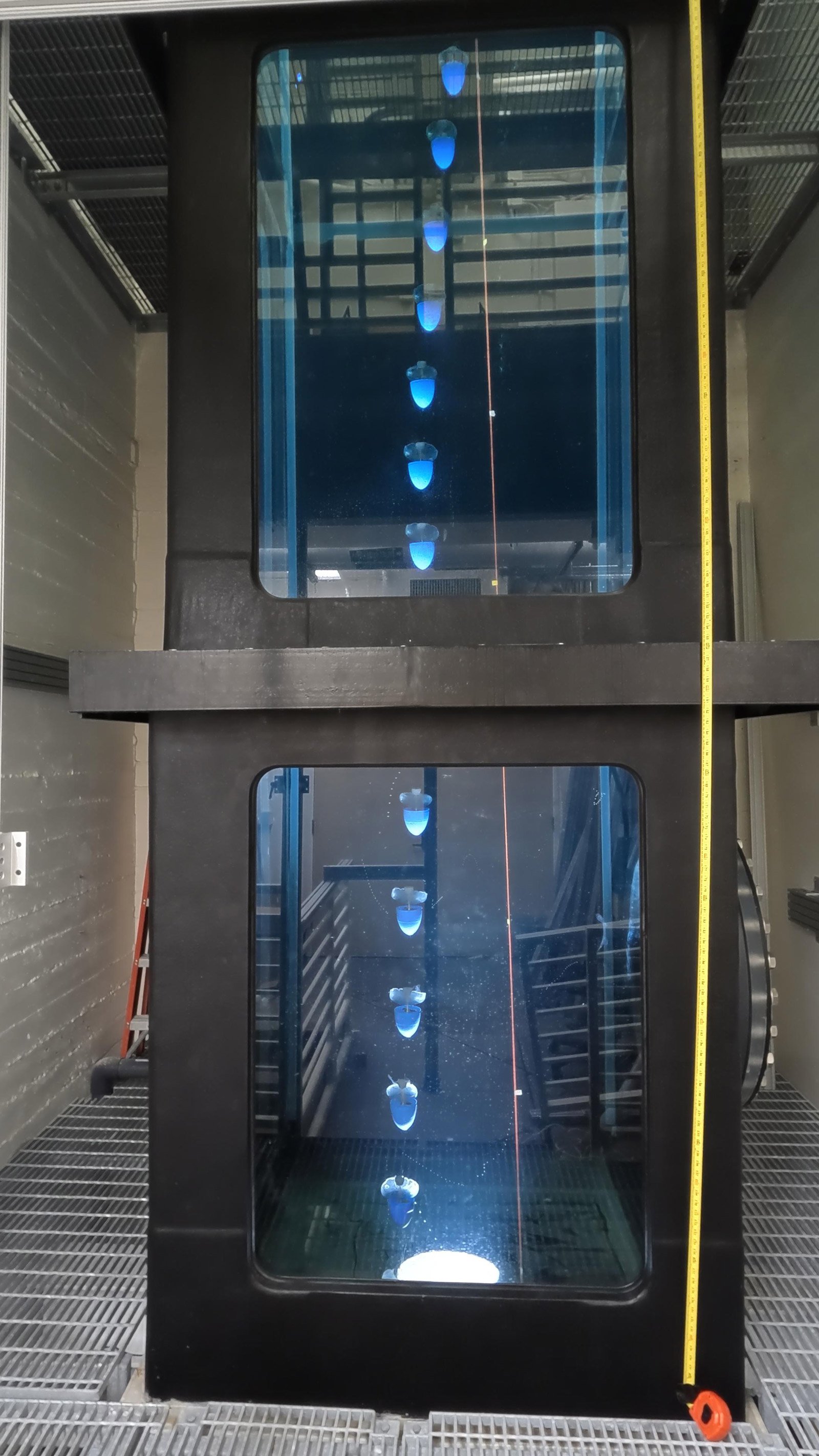 To test the augmented jellies' swimming abilities, Dabiri's lab undertook the construction of a massive vertical aquarium inside Caltech's Guggenheim Laboratory. Dabiri explains that the three-story tank is tall, rather than wide, because researchers want to gather data on oceanic conditions far below the surface.