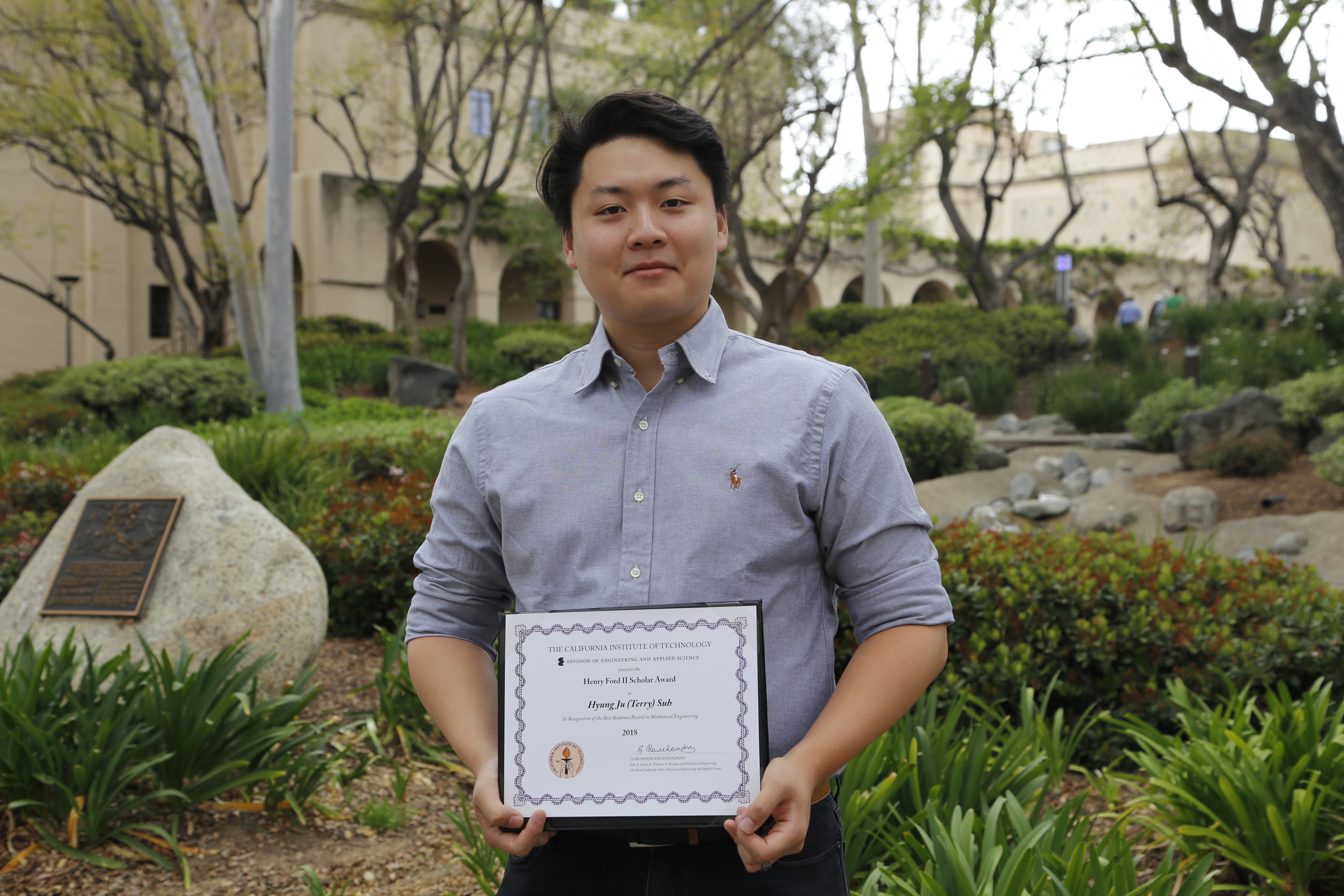Mechanical engineering student Hyung Ju (Terry) Suh, advised by Professor Joel Burdick, is a recipient of the 2018 Henry Ford II Scholar Award. He has broad interests in robotics including manipulation, perception, navigation, localization, and intelligence. The Henry Ford II Scholar Award is funded under an endowment provided by the Ford Motor Company Fund. The award is made annually to engineering students with the best academic record at the end of the third year of undergraduate study.