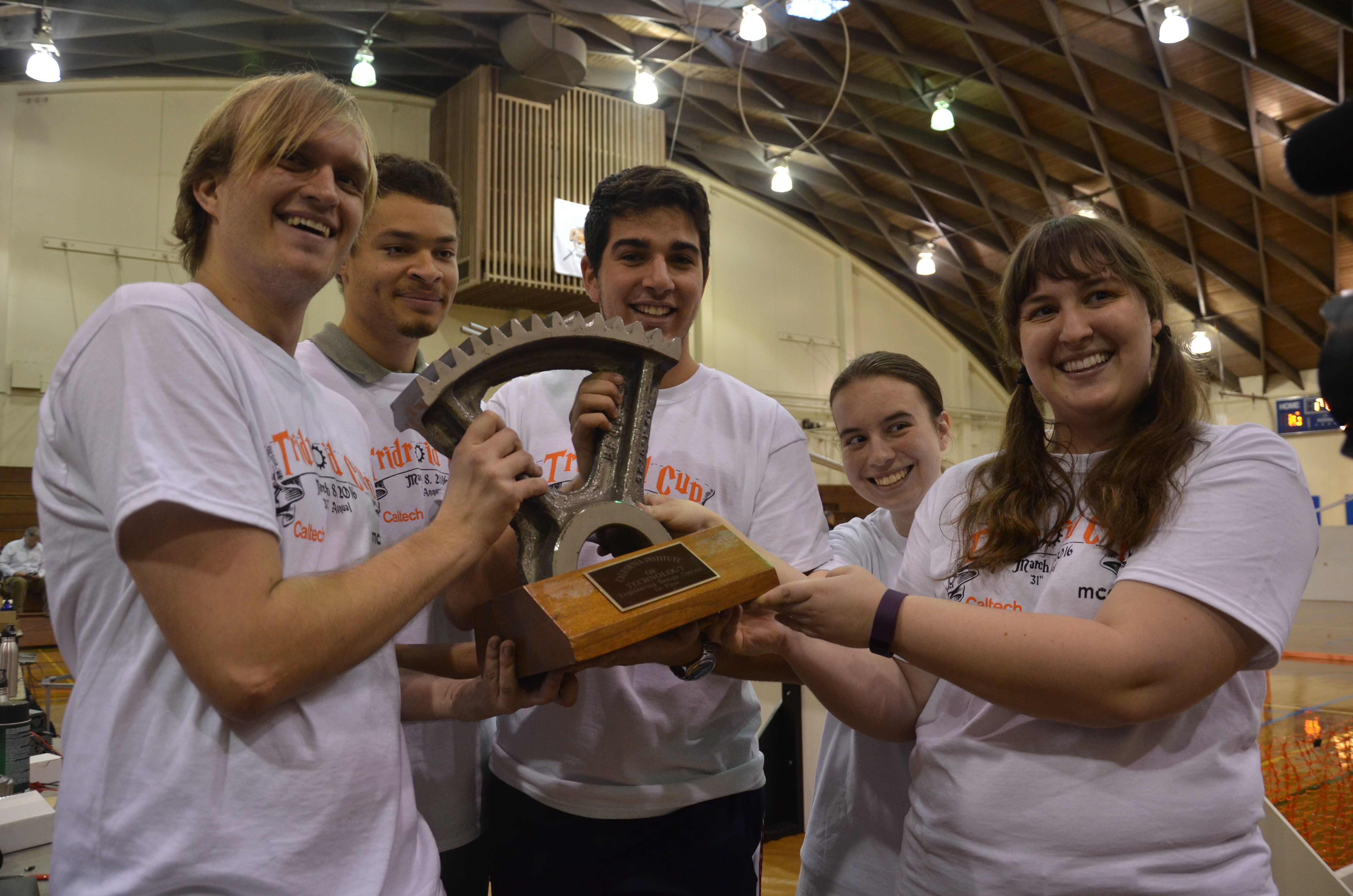 The students in this year's Mechanical Engineering 72 (ME72) class, a two-term engineering design lab for mechanical engineering majors, designed, built, and operated, under manual and/or autonomous control, robotic vehicles that could compete and withstand the physical rigors of a robot soccer matches played within a 24-ft x 48-ft arena in the Brown Gym. The 2016 winning team was “Blitzkrieg Bots.” [KPCC coverage]